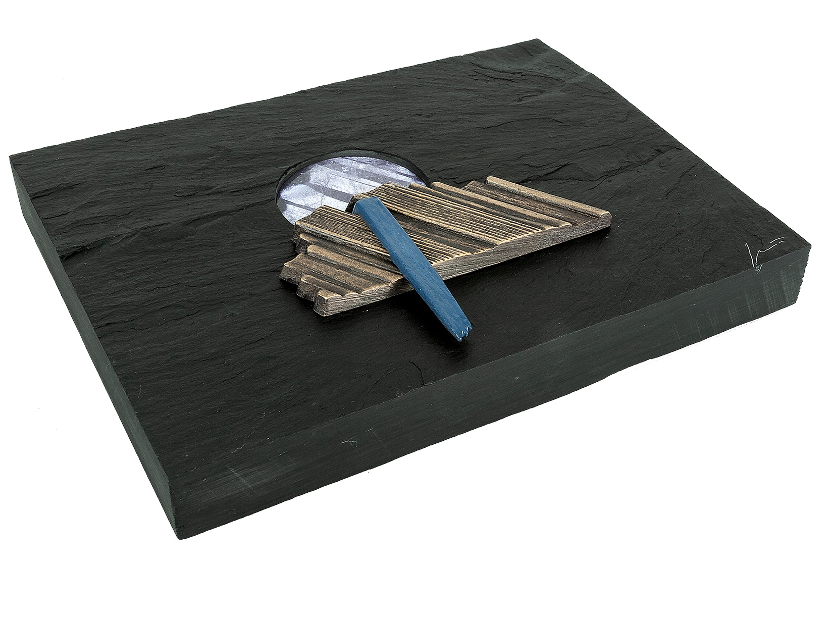 Wandobjekt aus Naturschiefer, Bronze und Messing, Wasserfall mit Airbrush